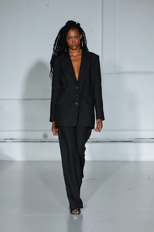 Veste de costume portée sans rien en dessous et pantalon loose aperçus sur le défilé Mossi © Mossi