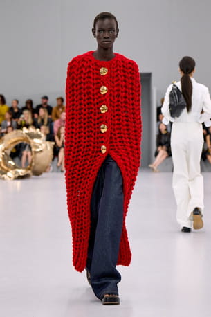 Long gilet rouge tricoté à boutons dorés et denim brut aperçus sur le défilé Loewe