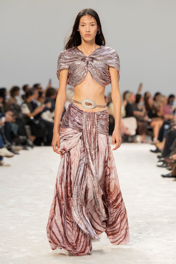 Crop top champagne métallisé et longue jupe imprimée aperçus sur le défilé Rabanne © Rabanne