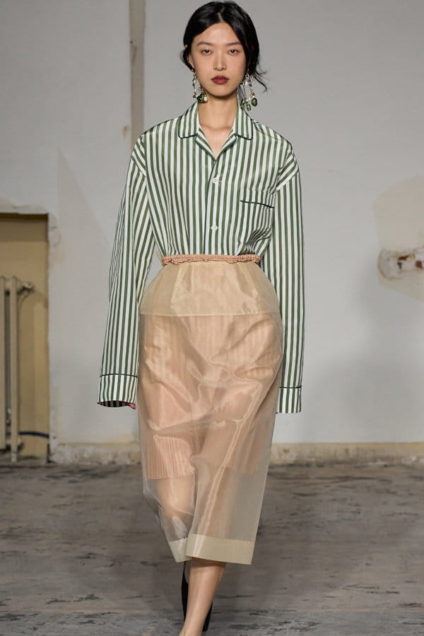 Chemise à rayures blanche et verte et jupe transparente beige aperçues sur le défilé Carven