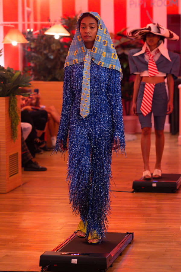 Robe métallisée à franges, cravate imprimée et fichu à motifs aperçus sur le défilé J. Simone © J. Simone