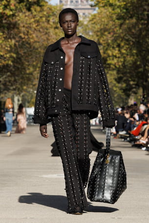 Veste en denim noire à œillets et pantalon coordonné aperçus sur le défilé Stella McCartney © Stella McCartney