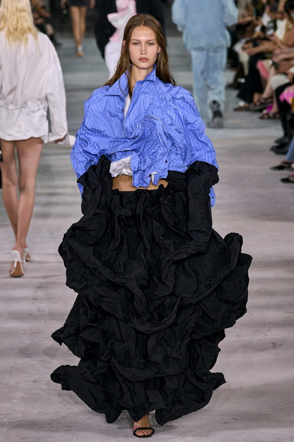 Chemise bleue à volants et maxi jupe noire aperçues sur le défilé Y/Project printemps-été 2024 à Paris.
