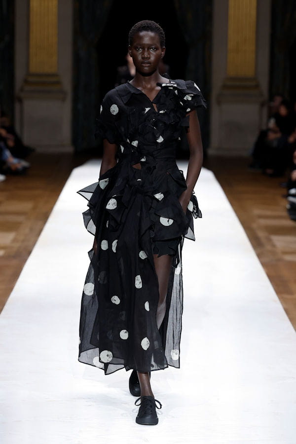 Robe noire à pois blancs et volants aperçue sur le défilé Yohji Yamamoto printemps-été 2024 à Paris.