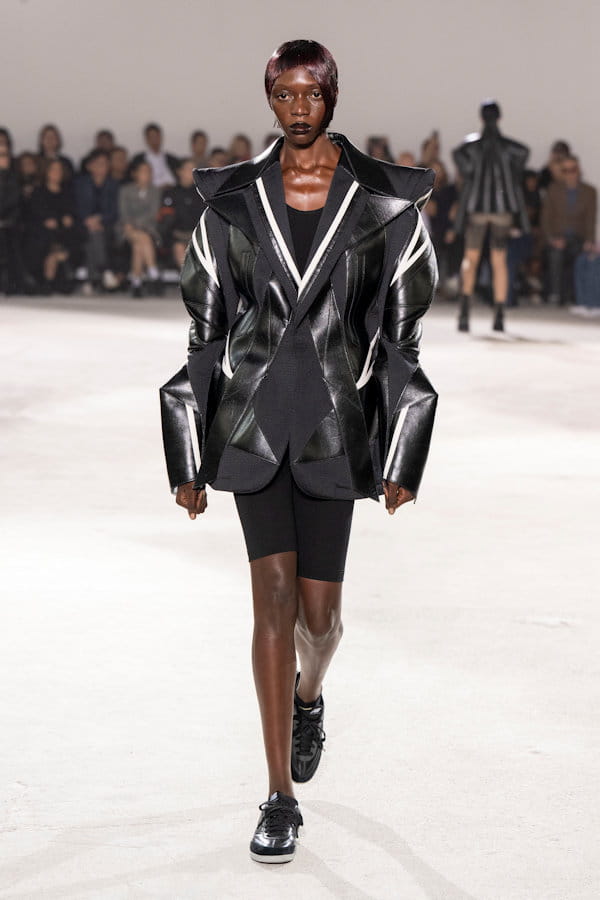 Veste en cuir à épaules oversize et cycliste noir aperçus sur le défilé Junya Watanabe © Junya Watanabe