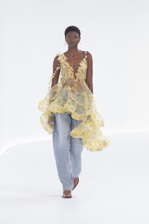 Robe asymétrique jaune pastel et jean loose aperçus sur le défilé Zimmermann © Zimmermann