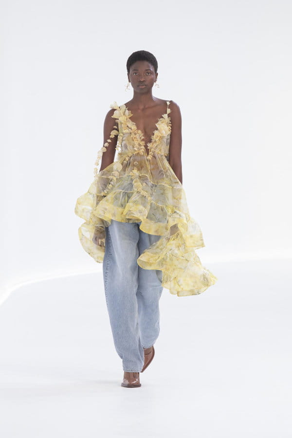 Robe asymétrique jaune pastel et jean loose aperçus sur le défilé Zimmermann
