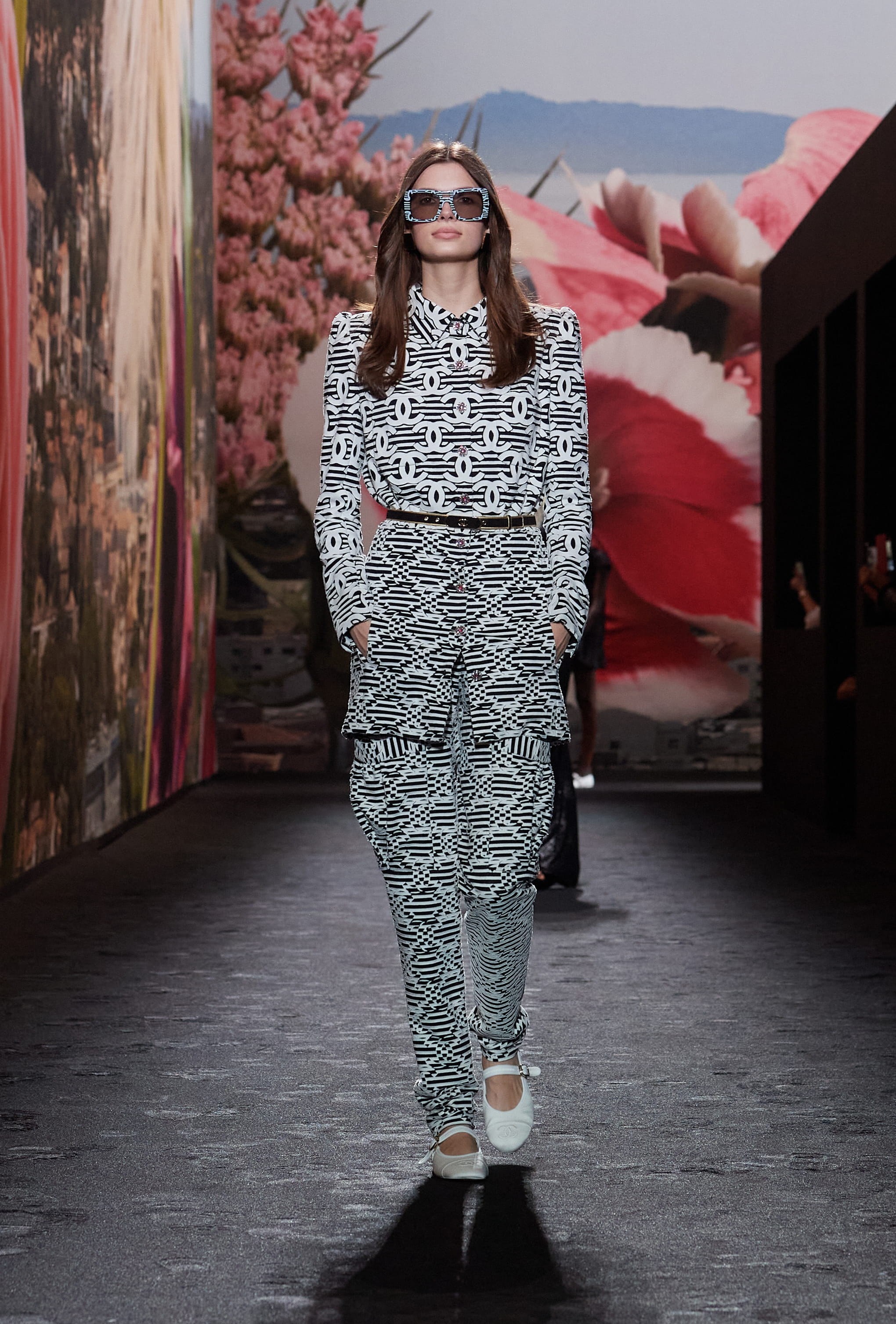 Ensemble imprimé noir et blanc et lunettes graphiques aperçus sur le défilé Chanel printemps-été 2024 à Paris.