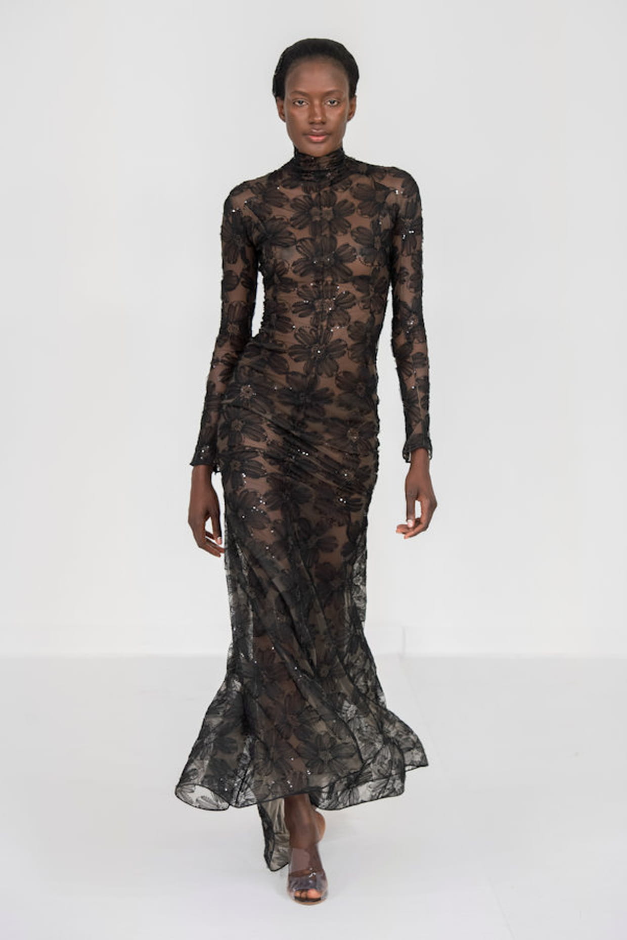 Longue robe noire en dentelle aperçue sur le défilé Alexis Mabille