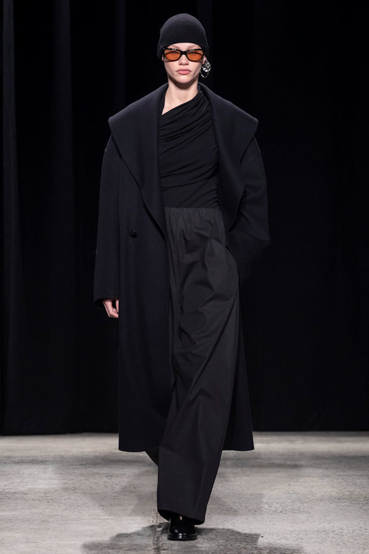 Long manteau noir, top asymétrique et pantalon oversize aperçus sur le défilé Fforme automne-hiver 2024-2025 à New York.
