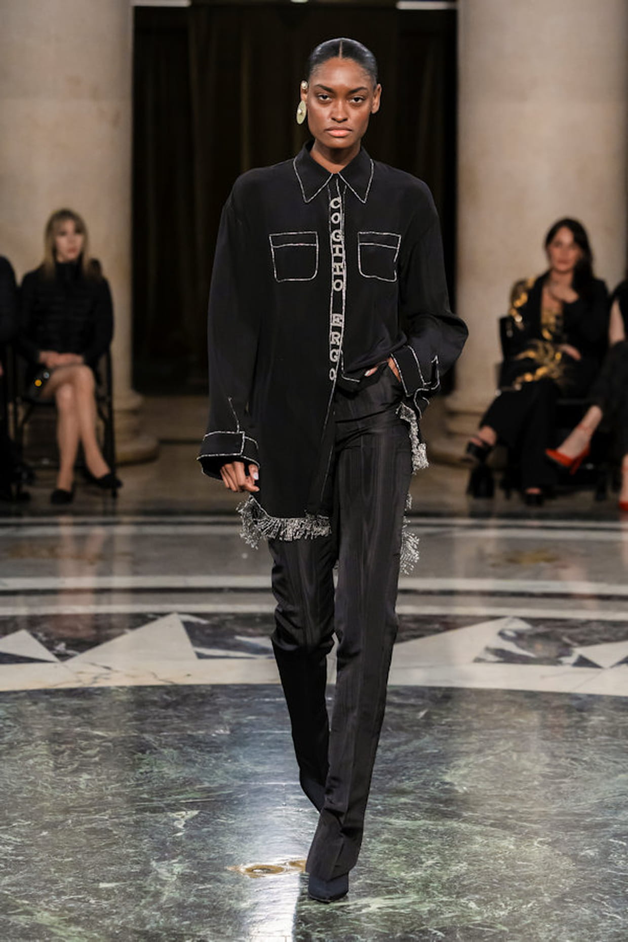 Longue chemise brodée et pantalon noir aperçus sur le défilé Cucculelli Shaheen automne-hiver 2024-2025 à New York.