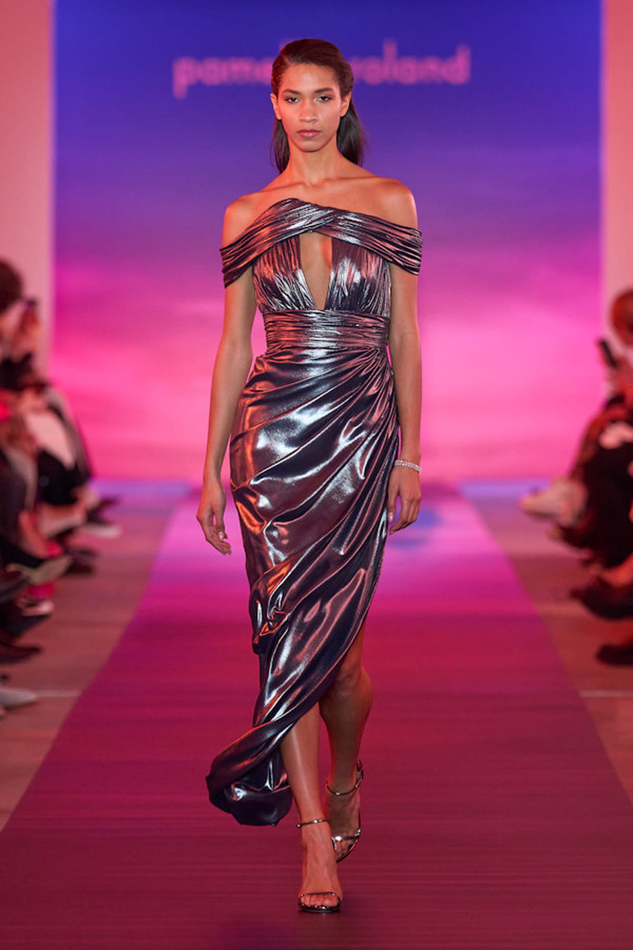 Robe argentée à encolure Bardot aperçue sur le défilé Pamella Roland automne-hiver 2024-2025 à New York.