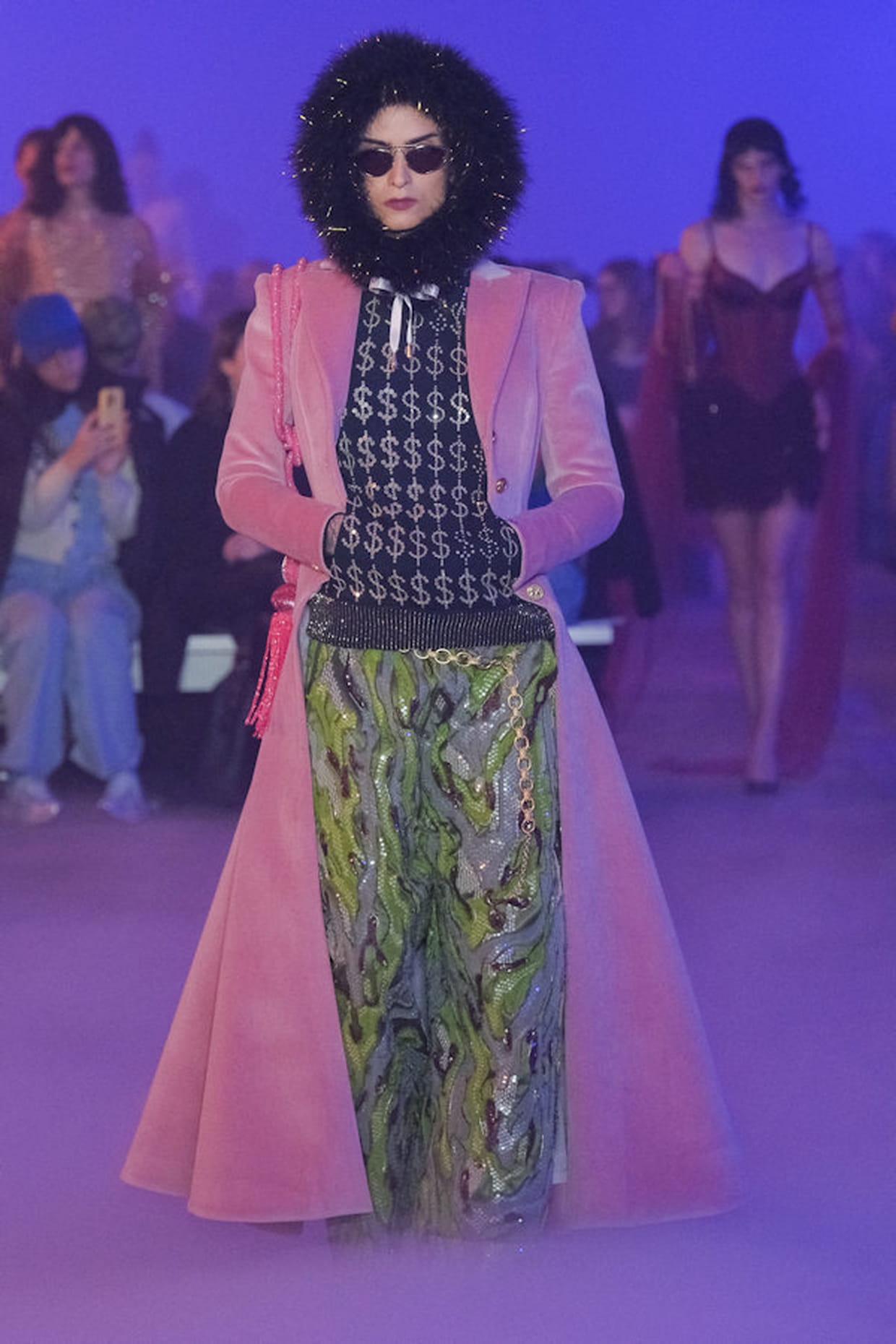Manteau rose, jupe à sequins et pull imprimé dollars aperçus sur le défilé Wiederhoeft