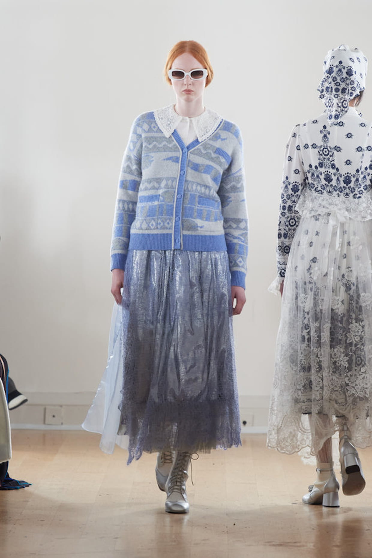 Gilet et jupon bleu et blanc aperçus sur le défilé Bora Aksu automne-hiver 2024-2025 à Londres.