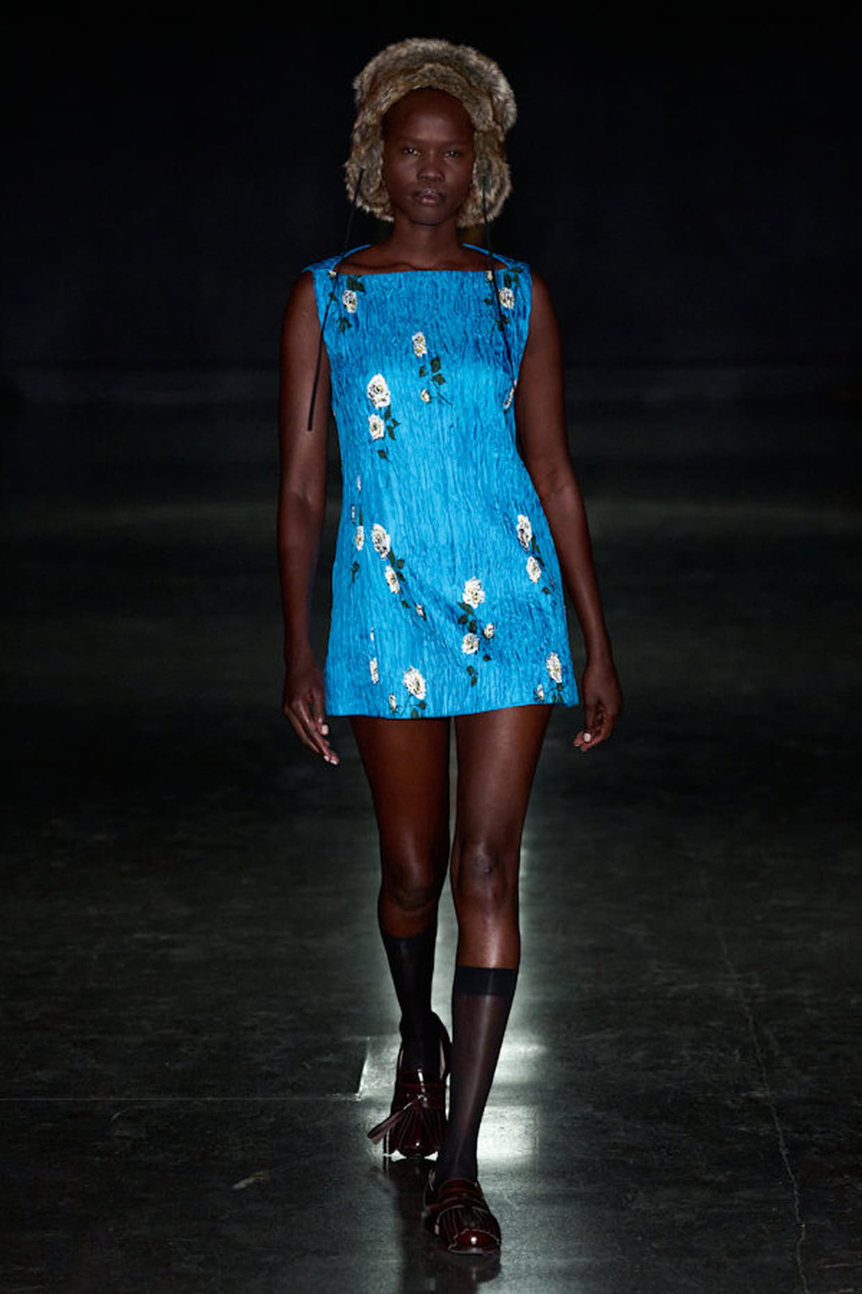 Robe bleue à motif marguerites aperçue sur le défilé Emilia Wickstead automne-hiver 2024-2025 à Londres.