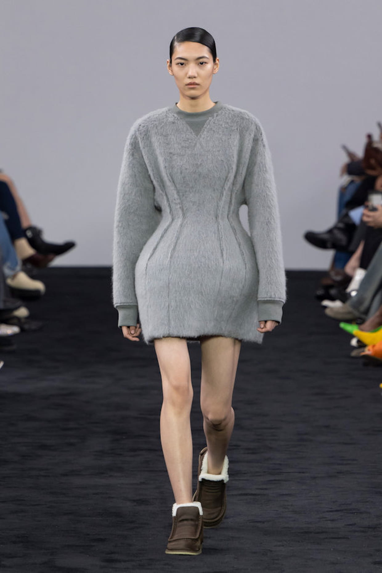 Robe grise à taille marquée aperçue sur le défilé JW Anderson