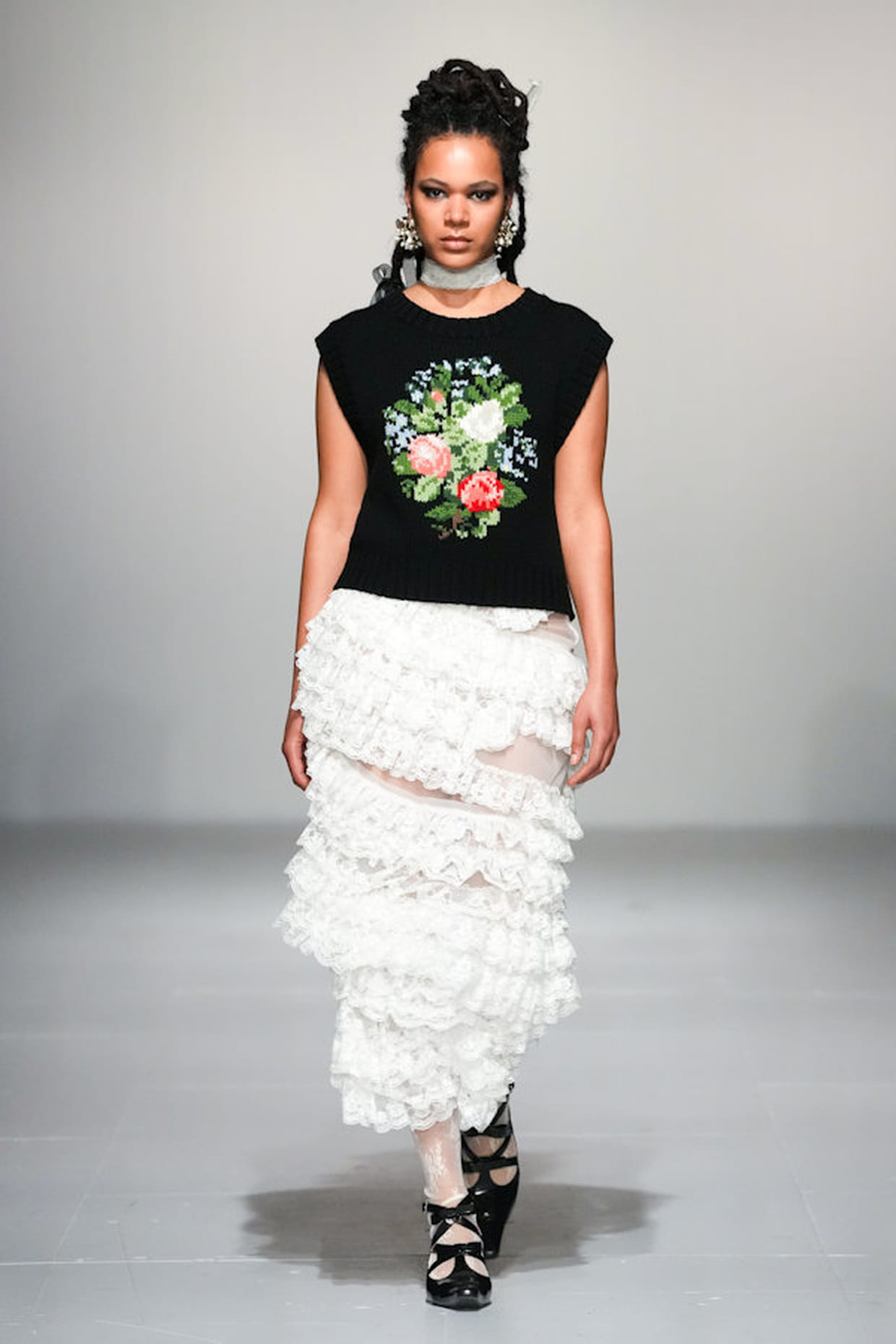 Jupe longue à volants et top sans manches aperçus sur le défilé Yuhan Wang automne-hiver 2024-2025 à Londres.