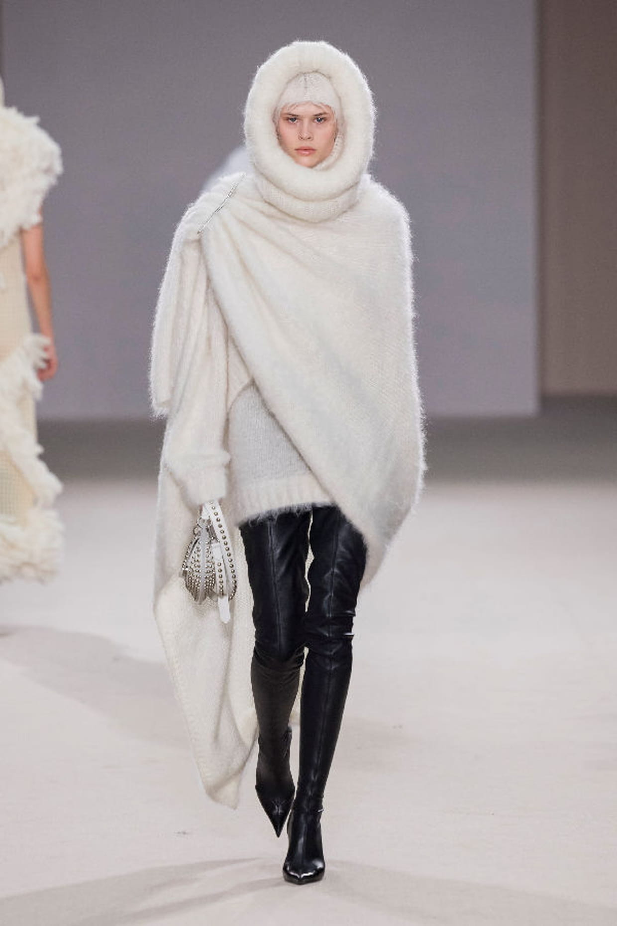 Tunique, châle asymétrique à capuche blanc et pantalon en cuir noir aperçus sur le défilé Del Core