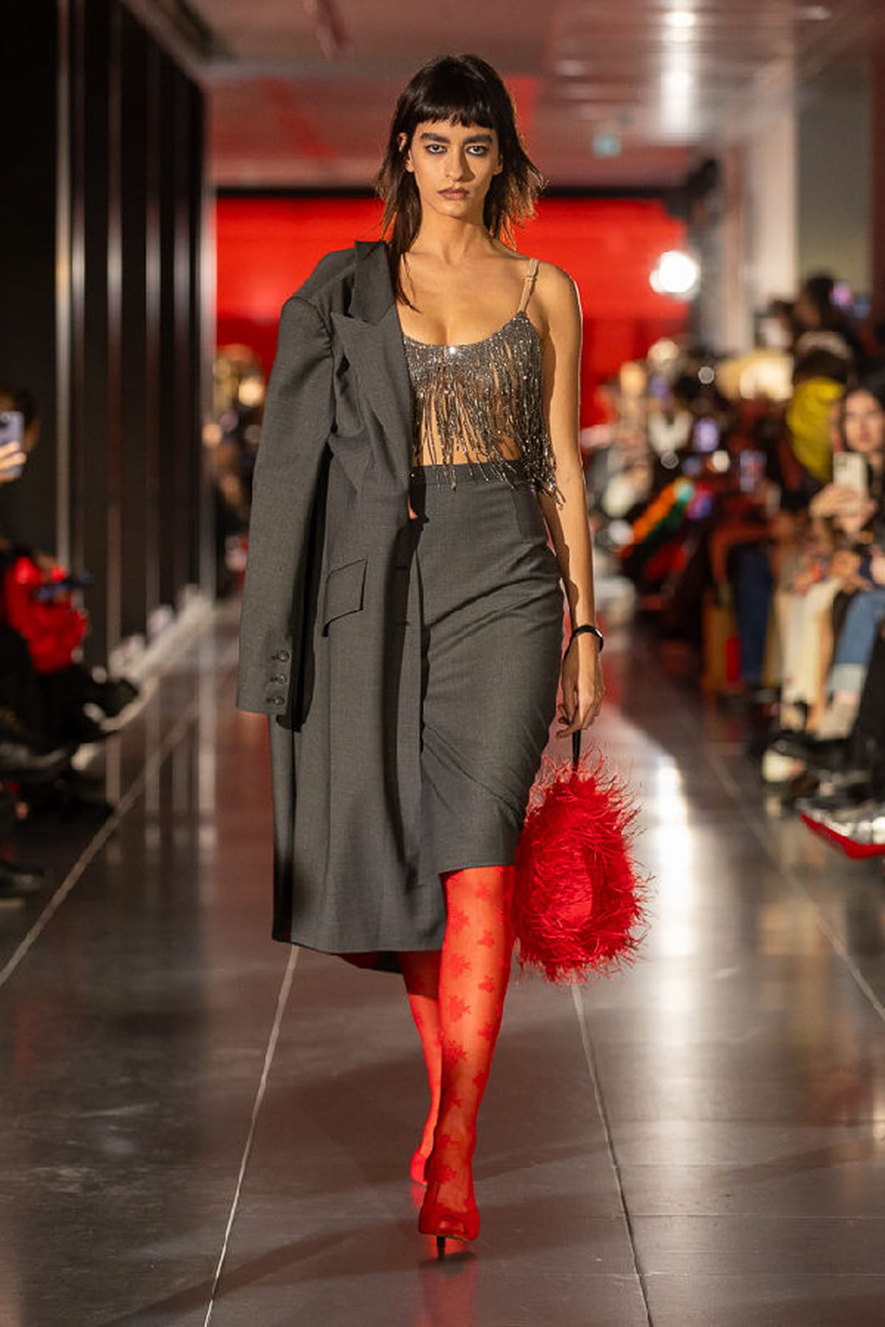 Top à franges strassées et collants rouges aperçus sur le défilé Frolov automne-hiver 2024-2025 à Londres.