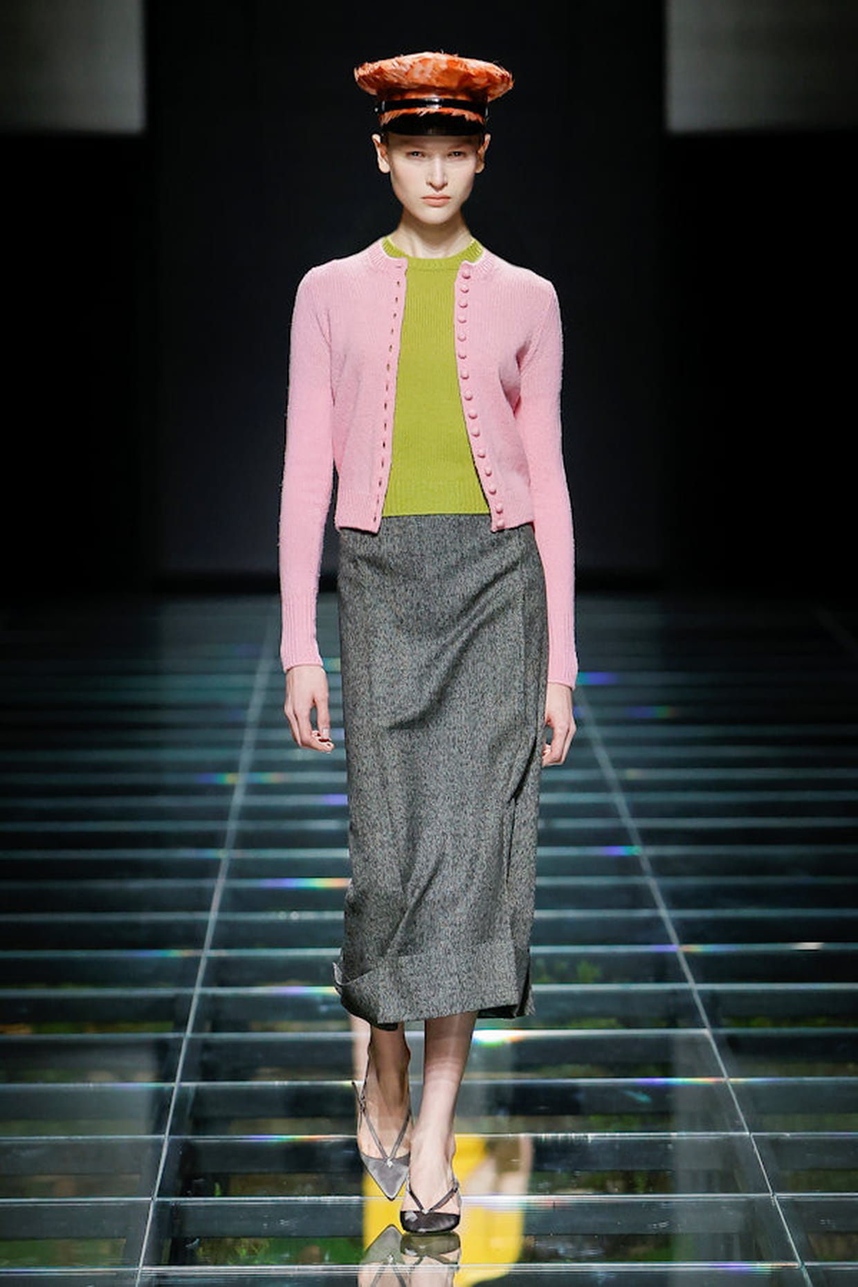 Longue jupe grise, cardigan rose et top vert aperçus sur le défilé Prada