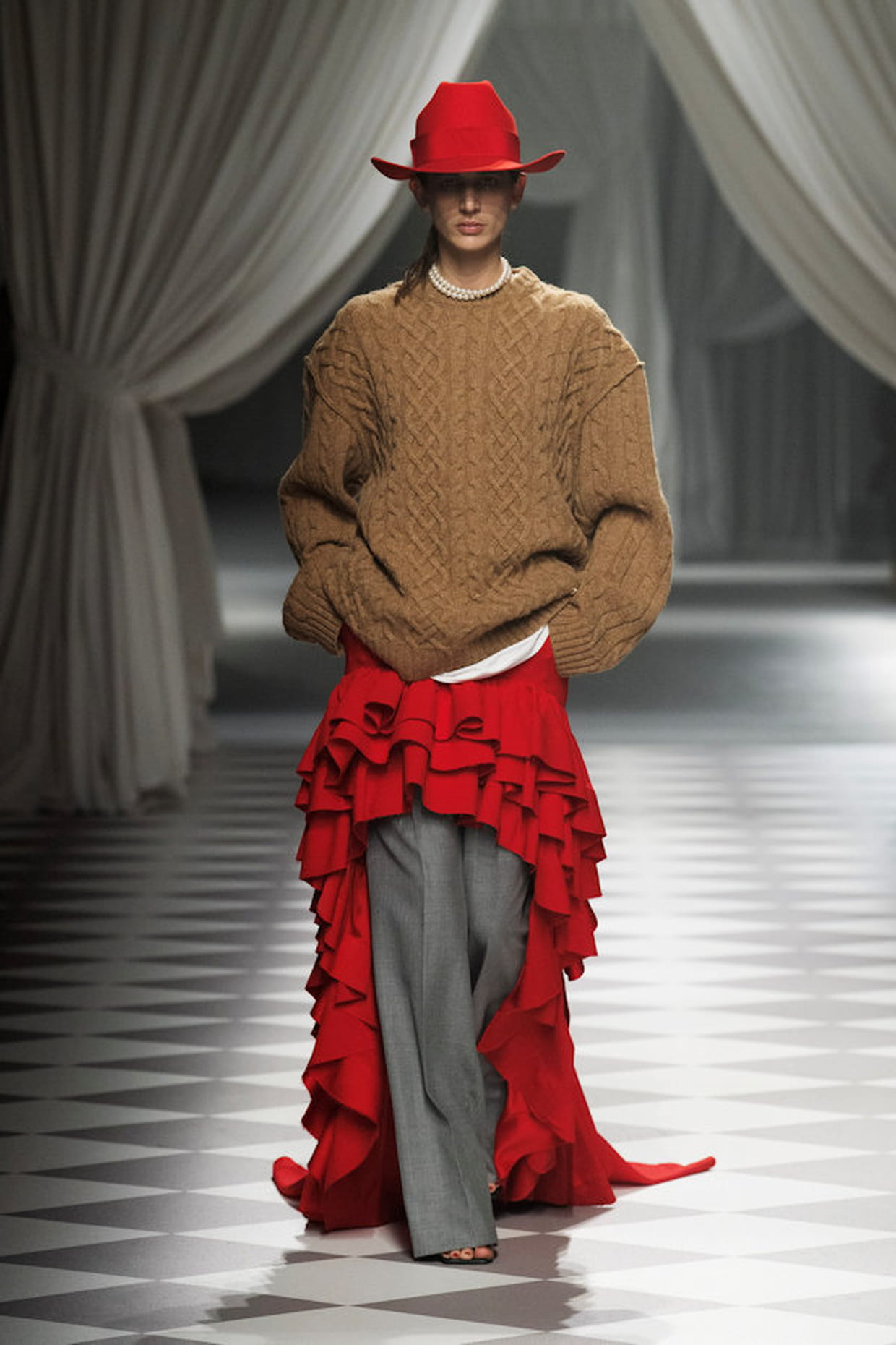 Jupe asymétrique, pull en maille et pantalon gris aperçus sur le défilé Moschino