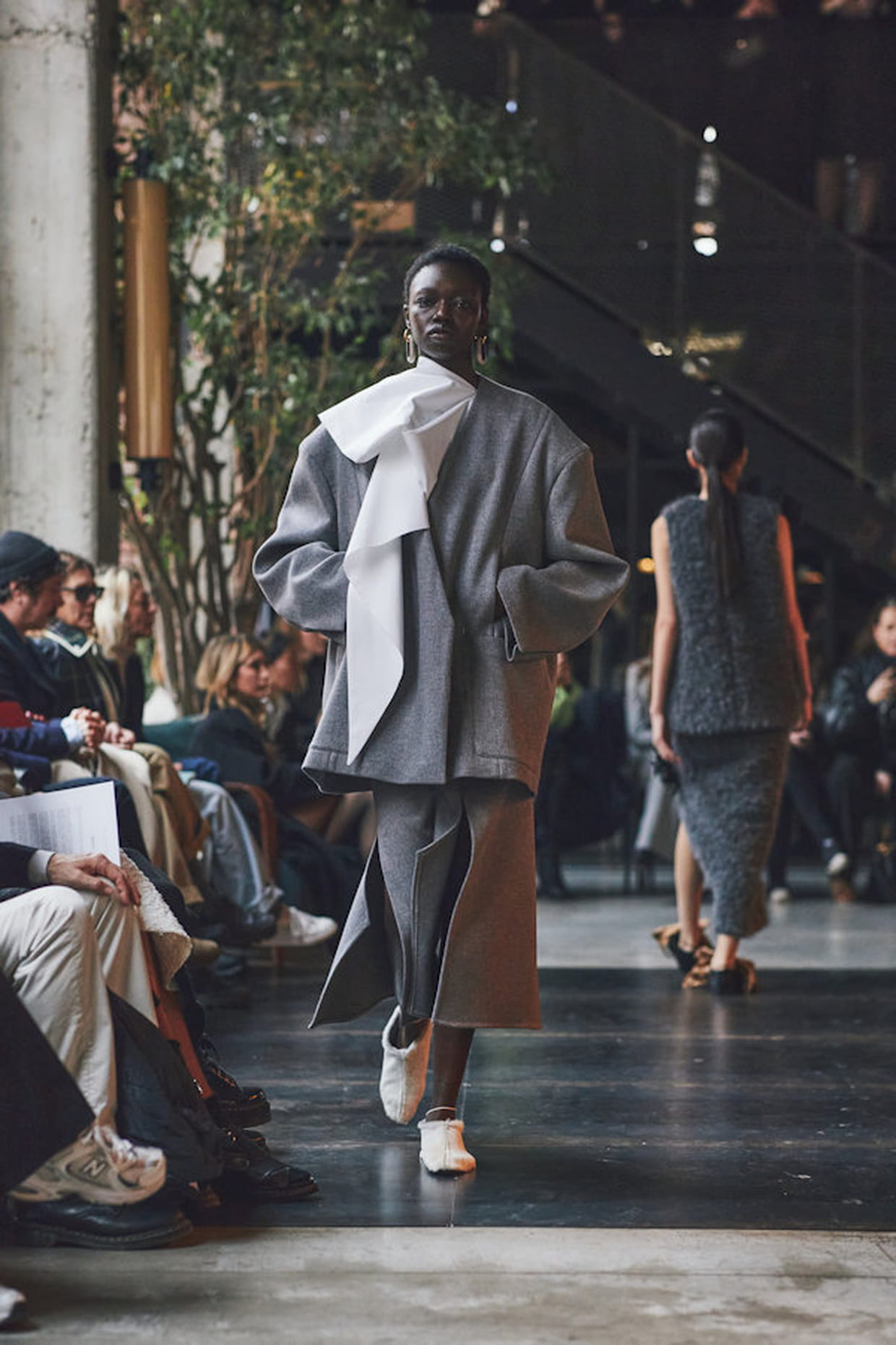 Jupe midi grise et veste coordonnée aperçues sur le défilé Calcaterra automne-hiver 2024-2025 à Milan.