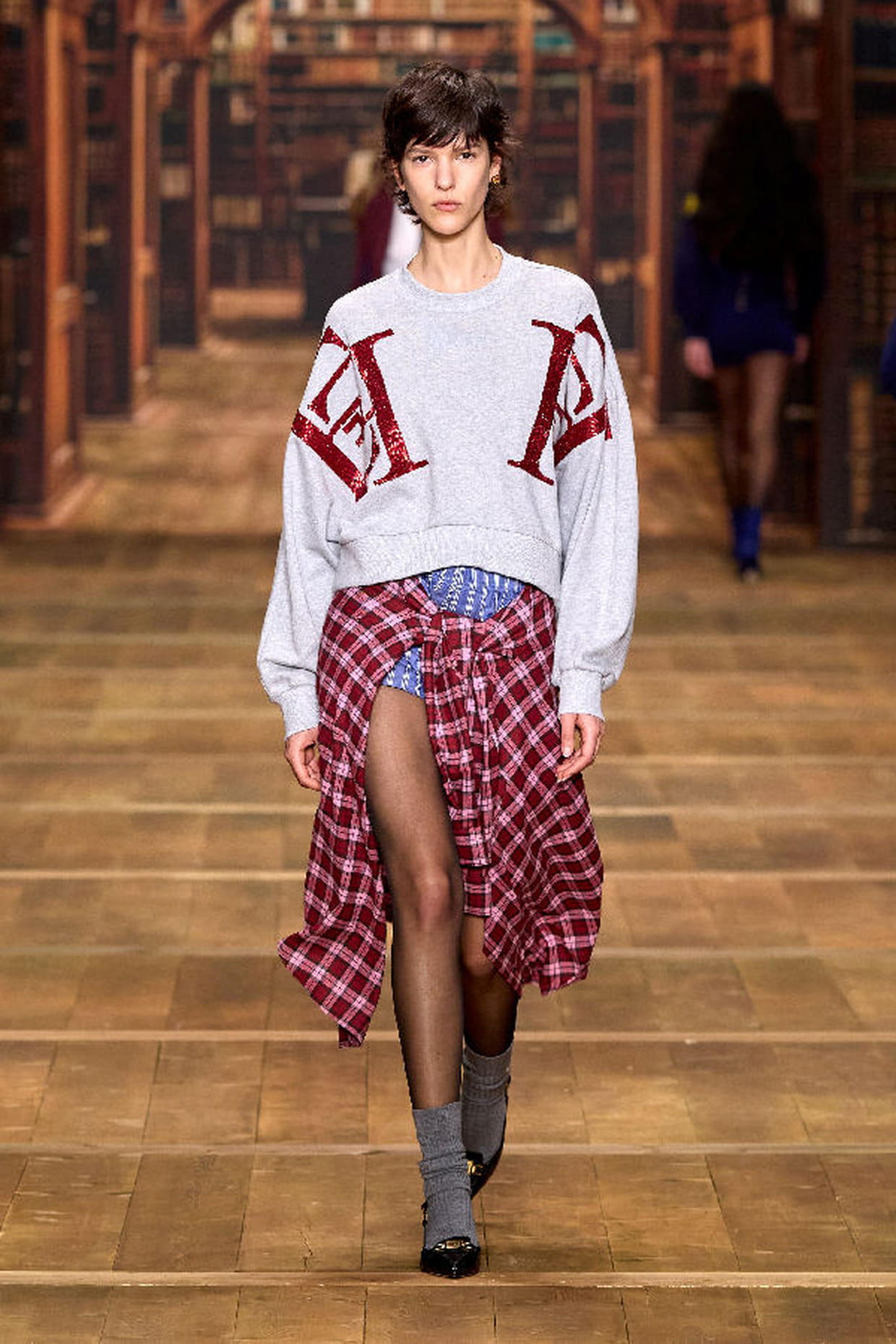 Chemise à carreaux rouges et pull oversize aperçus sur le défilé Elisabetta Franchi automne-hiver 2024-2025 à Milan.