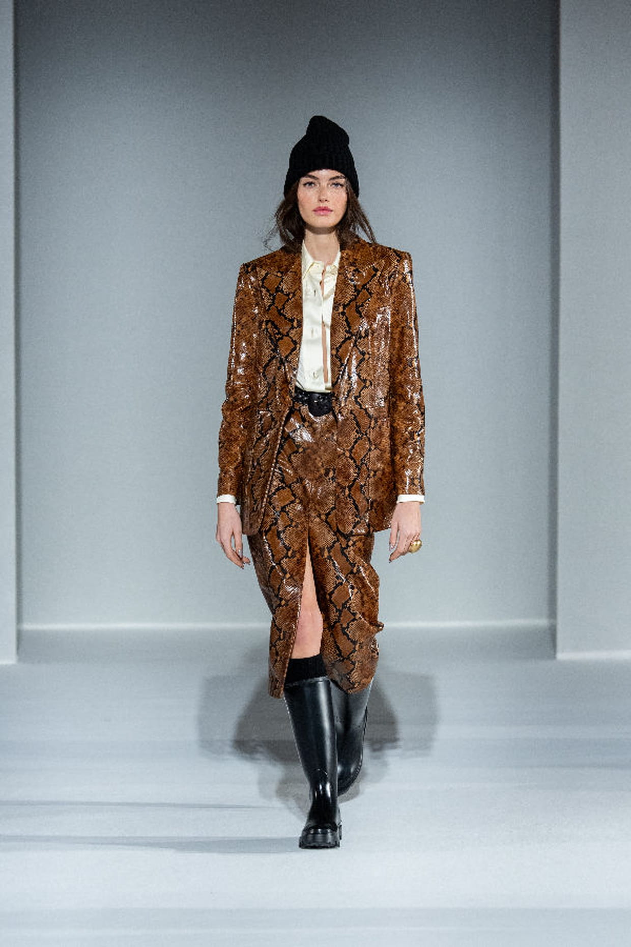 Jupe et veste à imprimé serpent aperçues sur le défilé Luisa Spagnoli