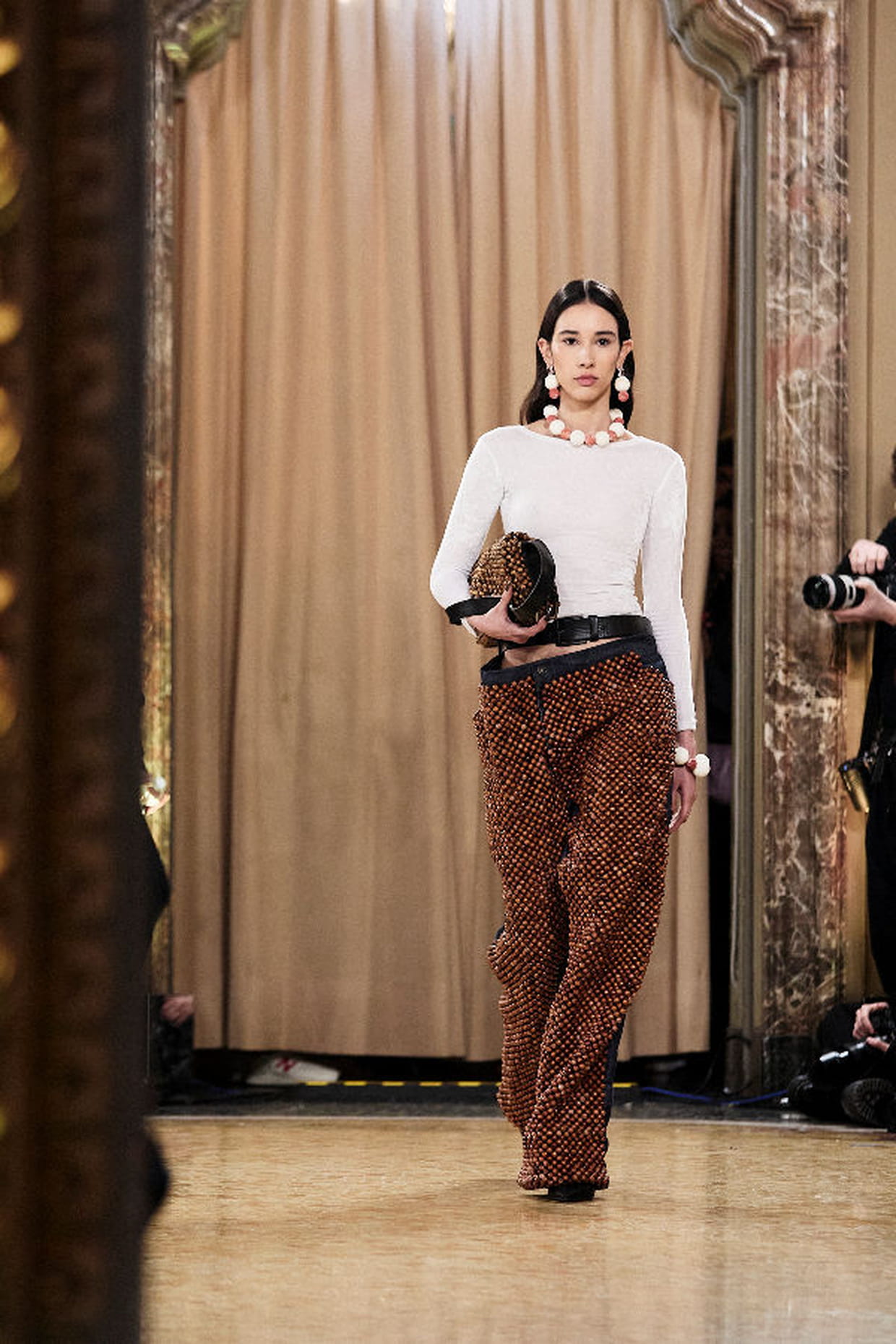 Top blanc et pantalon en perles de bois aperçus sur le défilé Tokyo James