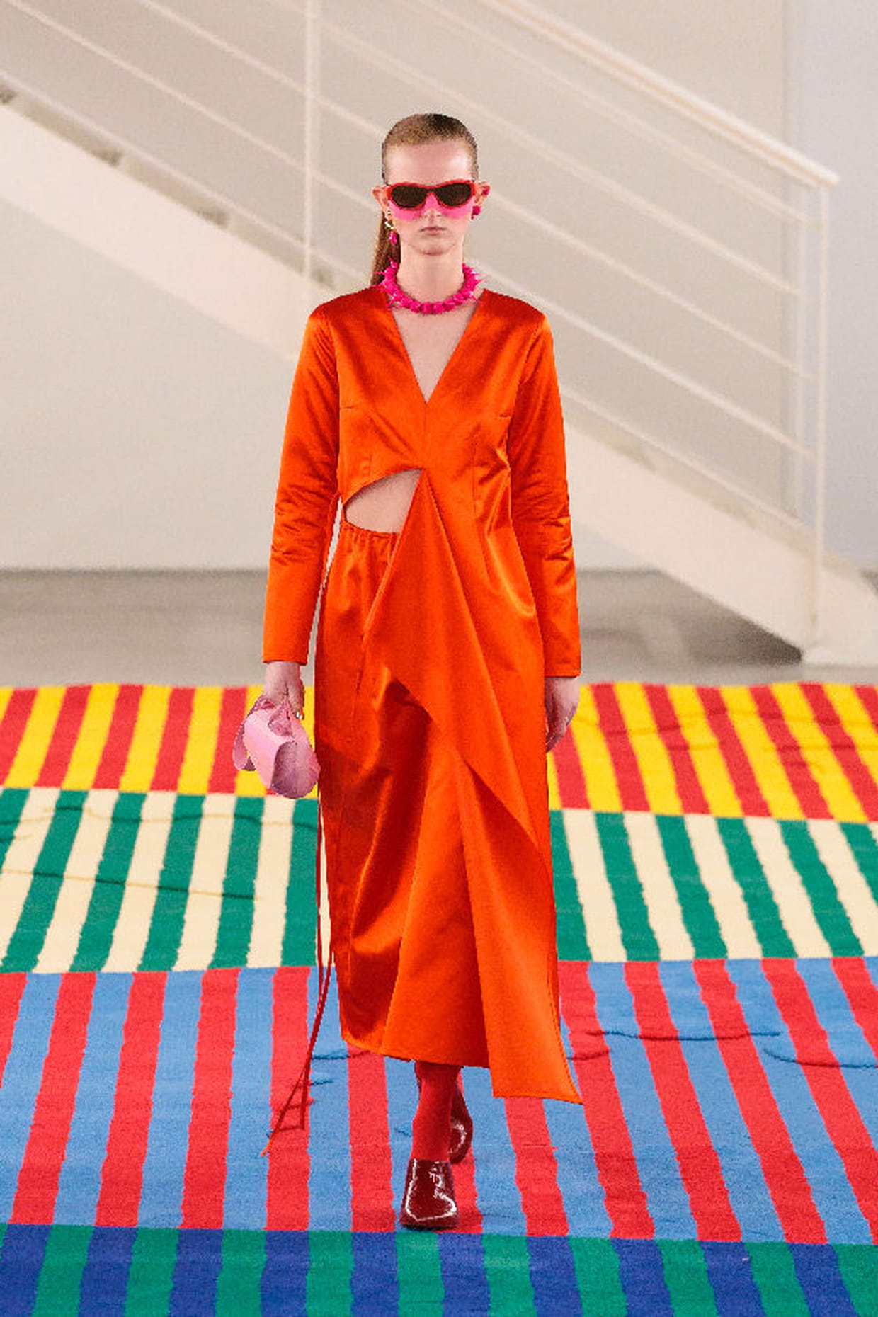 Robe orange à découpe aperçue sur le défilé Sunnei