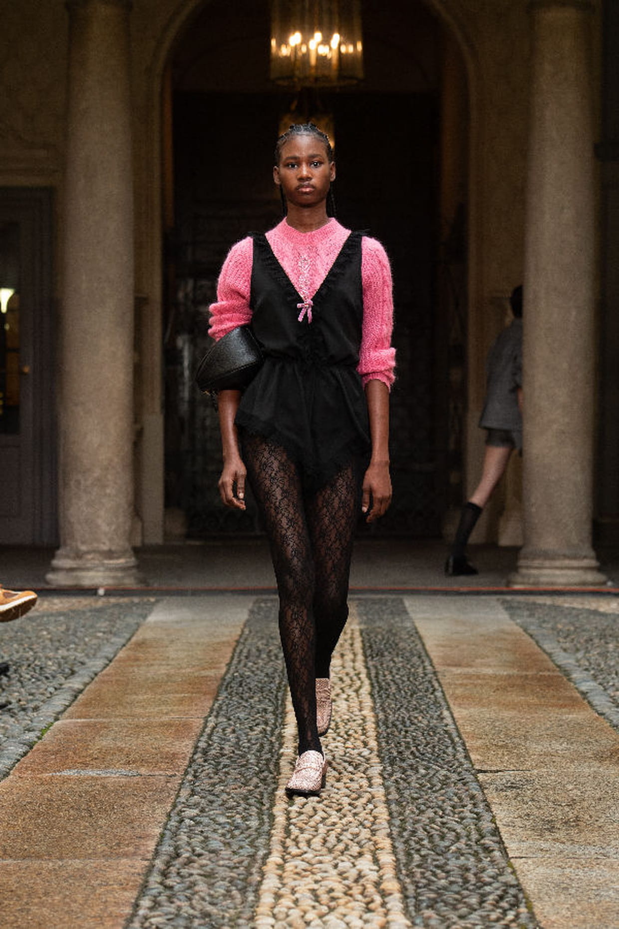 Pull rose et collants brodés aperçus sur le défilé Vivetta