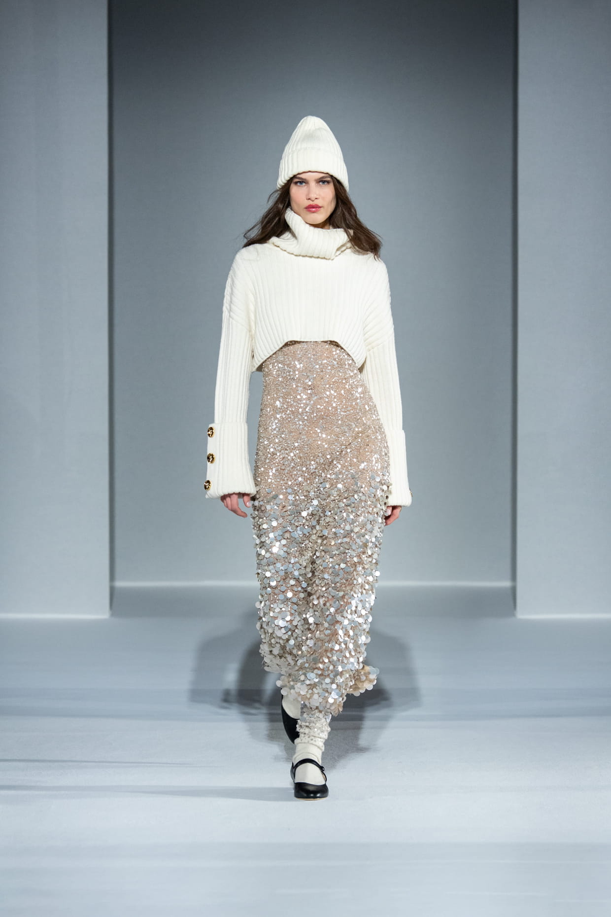 Jupe à sequins et pull immaculé aperçus sur le défilé Luisa Spagnoli automne-hiver 2024-2025 à Milan.