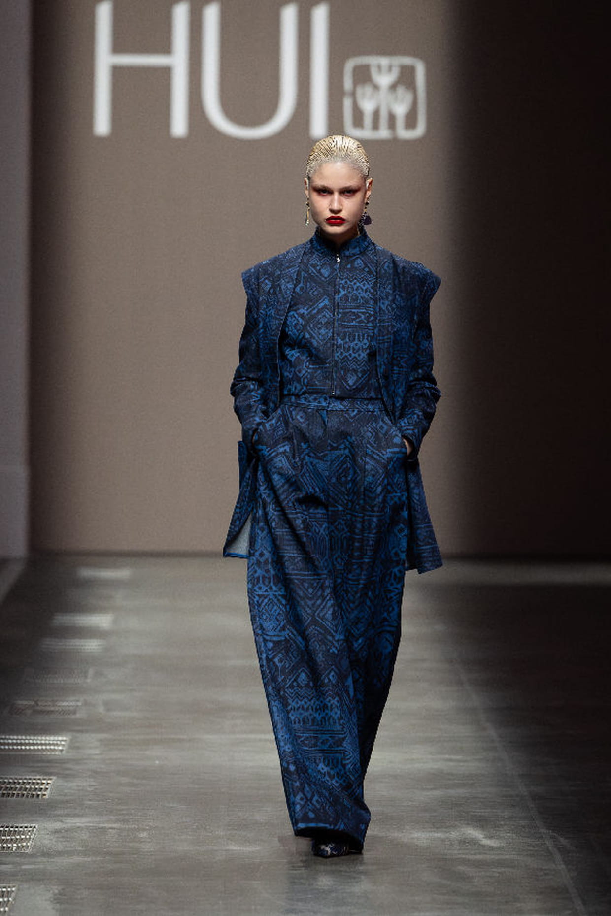 Veste, top et pantalon à motifs bleus aperçus sur le défilé Hui