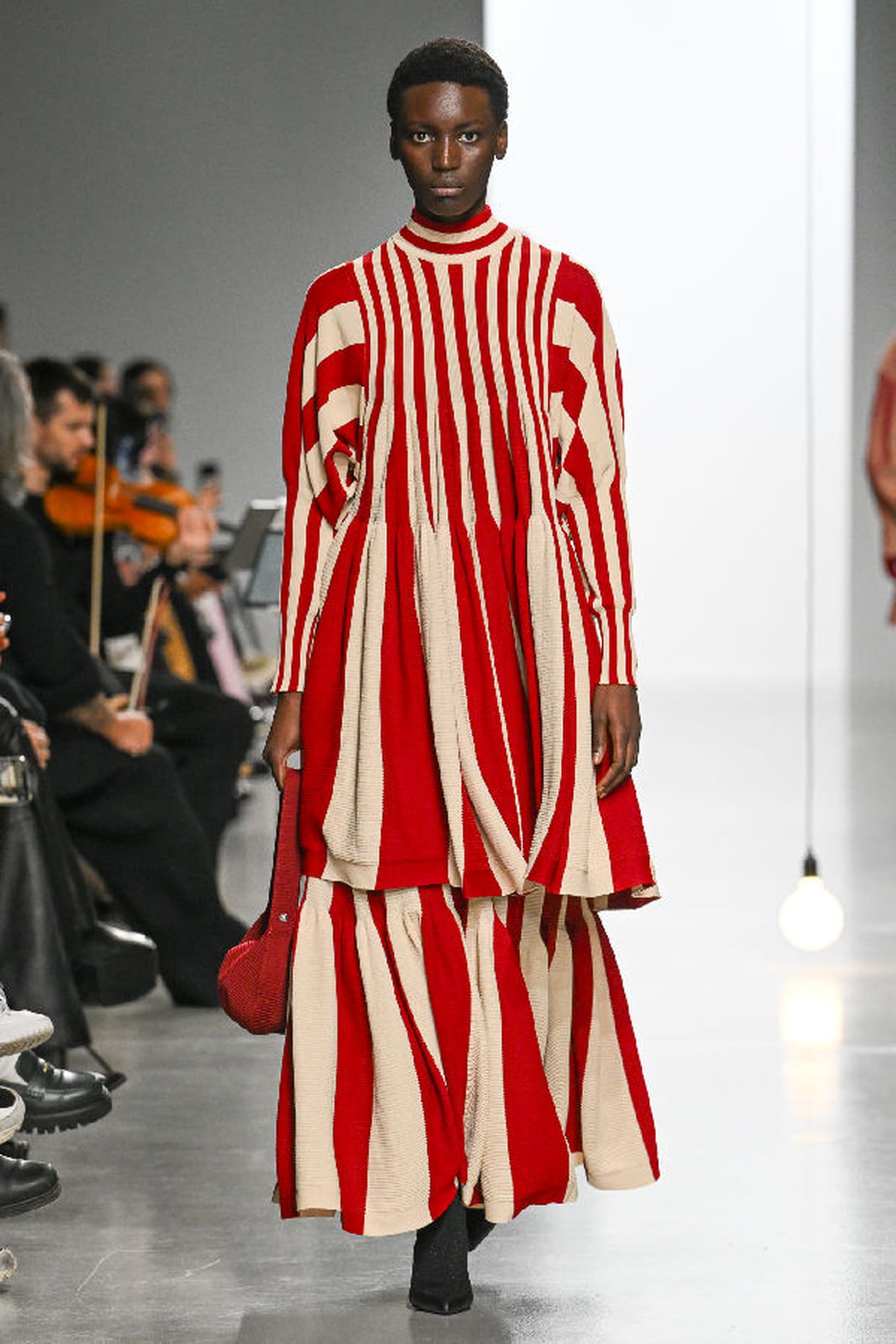 Robe rayée à volant aperçue sur le défilé CFCL automne-hiver 2024-2025 à Paris.