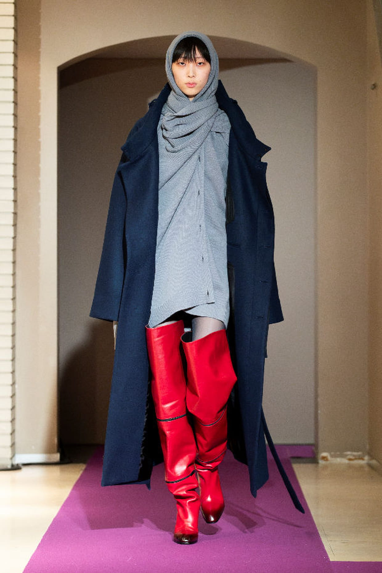 Robe torsadée à capuche et cuissardes rouges aperçues sur le défilé Marie Adam-Leenaerdt