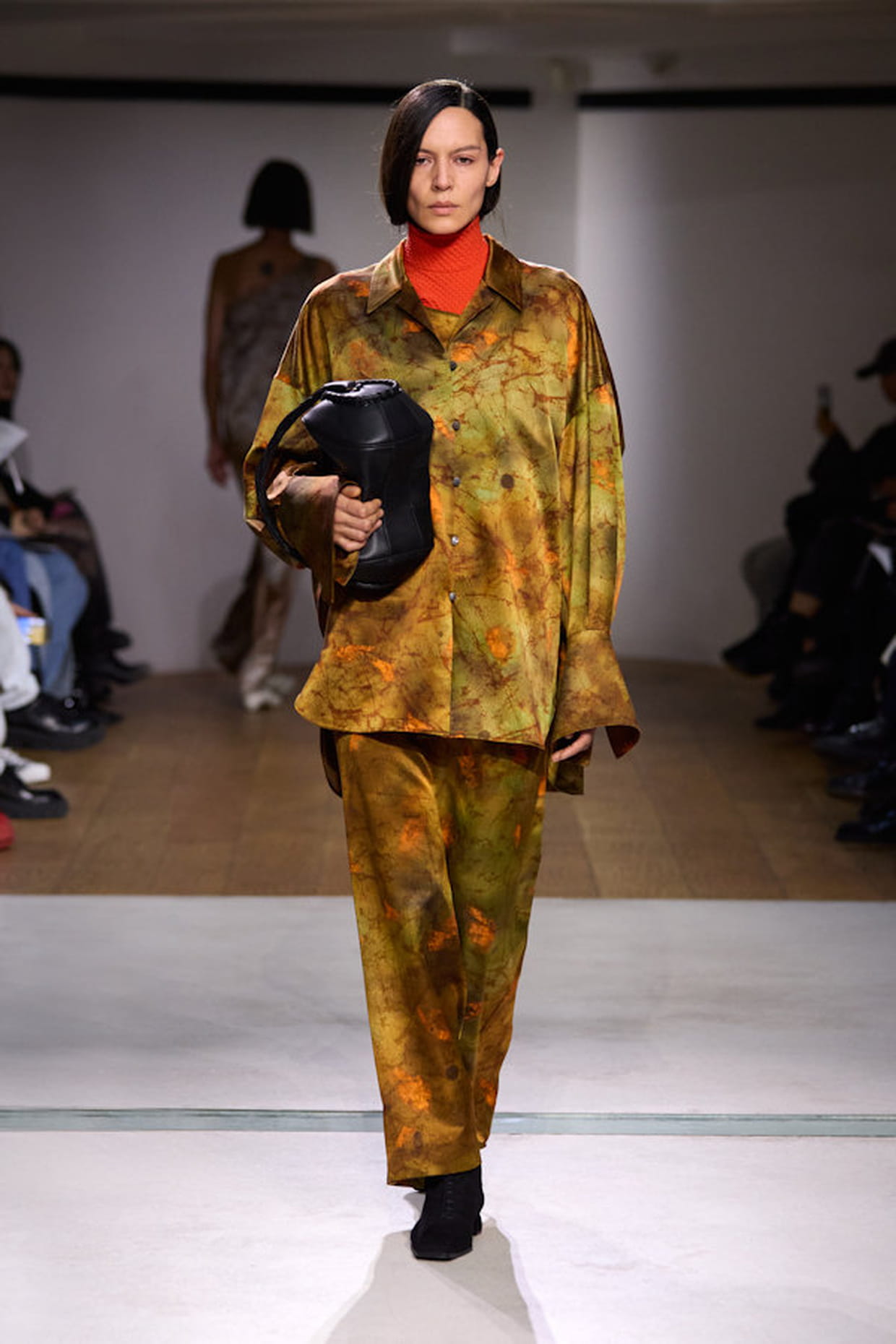 Chemise et pantalon imprimé aperçus sur le défilé Mame Kurogouchi automne-hiver 2024-2025 à Paris.
