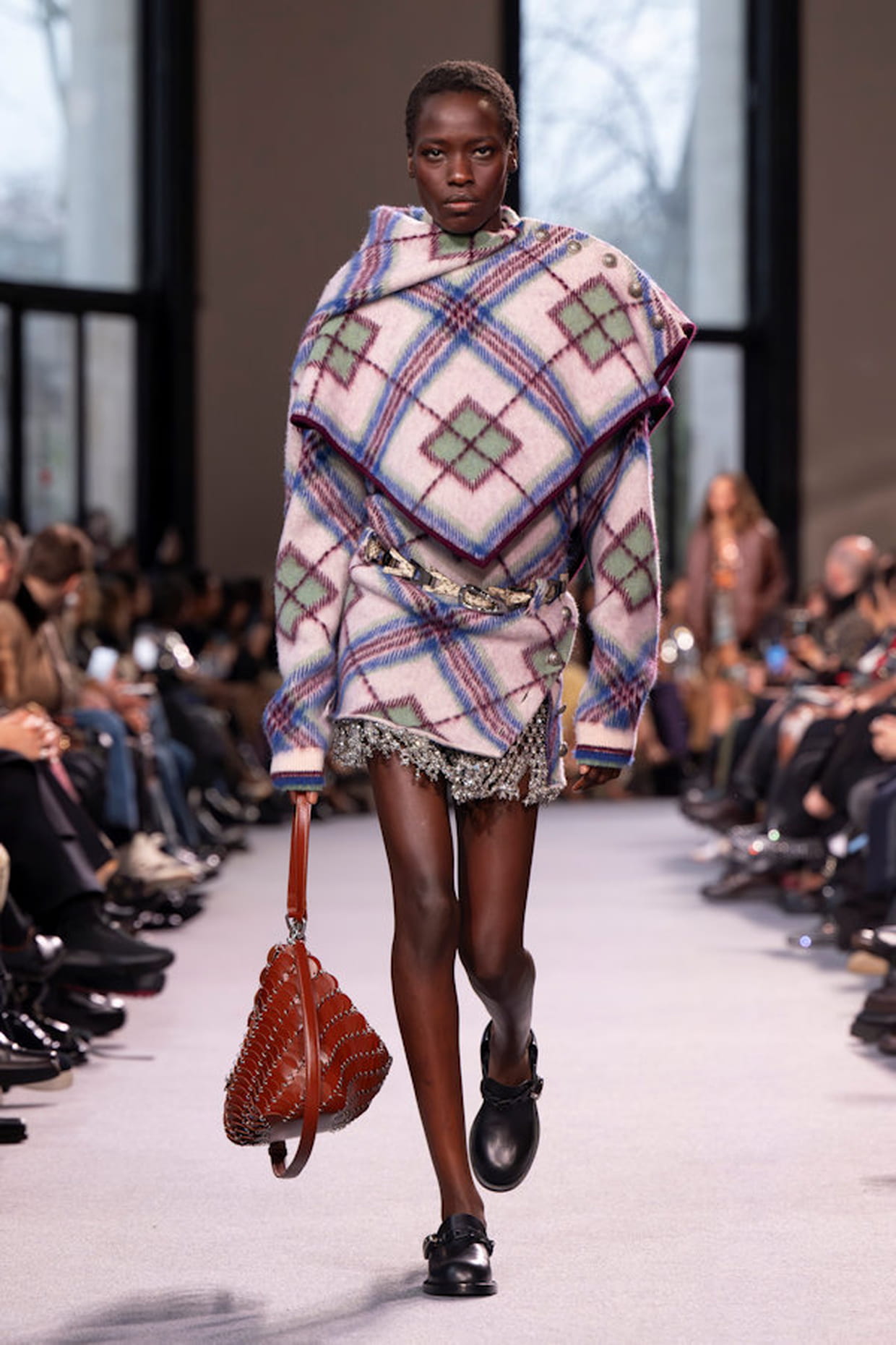 Jupe à carreaux et franges et top coordonné aperçus sur le défilé Rabanne automne-hiver 2024-2025 à Paris.