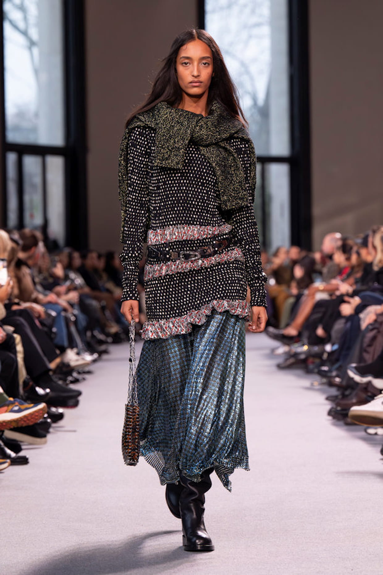 Longue jupe irisée et top à manches longues cloutés aperçus sur le défilé Rabanne automne-hiver 2024-2025 à Paris.