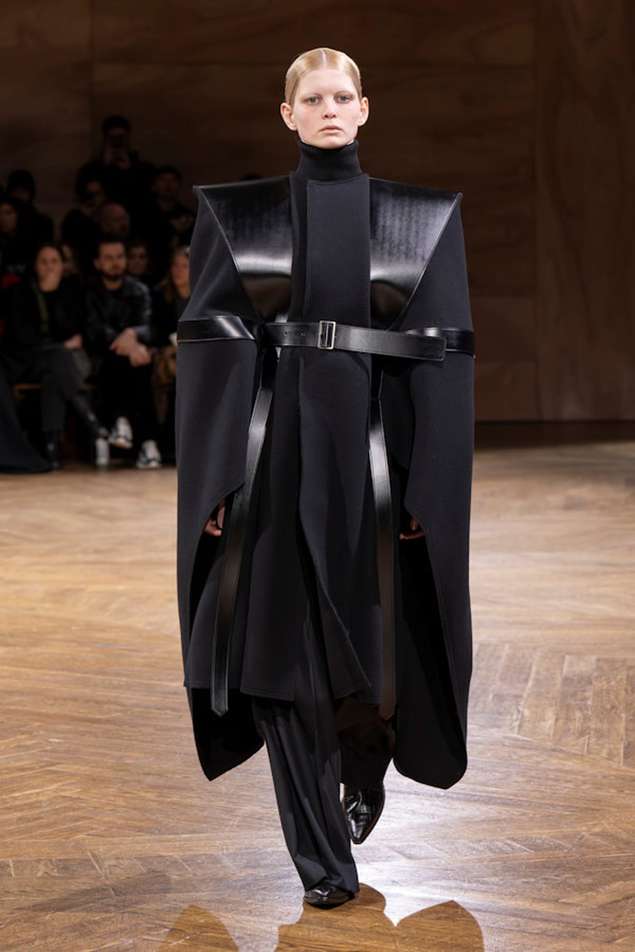 Manteau avec structure en cuir et pantalon noir aperçus sur le défilé Junya Watanabe automne-hiver 2024-2025 à Paris.