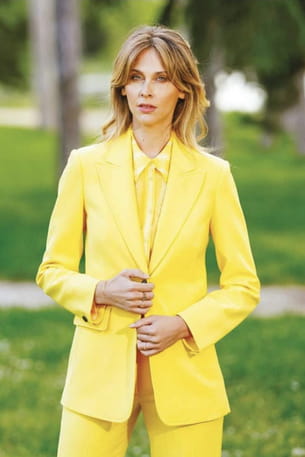 Sur Instagram, Ophélie Meunier n'est pas passée inaperçue puisqu'elle portait un costume deux pièces jaune bouton d'or. Elle l'avait associé à une chemise de la même couleur vibrante, ponctuée de rayures blanches, et il faut avouer qu'elle était rayonnante. Ce look de working-girl coloré mettait en valeur sa silhouette et son teint.
