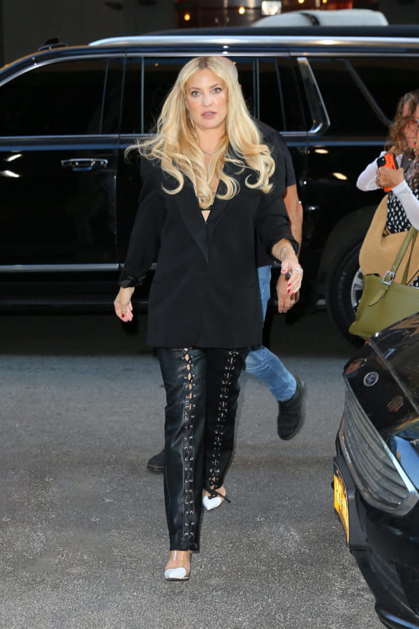 Kate Hudson était de sortie dans les rues de New York, ce jeudi 11 juillet. Et une fois de plus, l'actrice et productrice a donné une leçon de style en associant un pantalon en cuir noué à une pièce de lingerie, un large blazer noir et une paire de talons transparents au bout blanc. Le but ? Casser l'aspect rock que peut conférer ce dernier. Et c'est un sans faute !