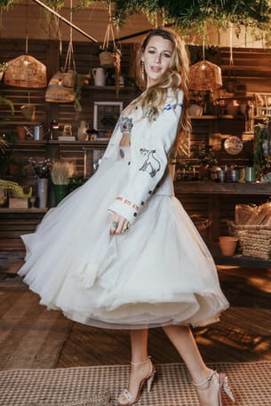 Sur Instagram, Blake Lively est apparue habillée d'une jupe en tulle mi-longue façon tutu. Pour aller avec, la star a choisi d'arborer une brassière agrémentée de broderies et une veste brodée de la même teinte, jouant ainsi avec différentes matières. Et pour prendre de la hauteur, elle a chaussé des sandales à talons Louboutin. Un clin d'œil à la tenue iconique de Carrie Bradshaw dans Sex and the City ?
