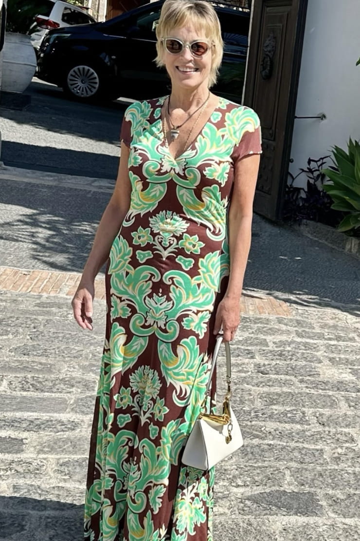 Ce dimanche 21 juillet, Sharon Stone a adopté la tenue parfaite pour une chaude journée d'été, sur Instagram. Soit, une longue robe marron à manches courtes, décolletée en V et parsemée de motifs colorés. Un modèle signé Etro accordé à un sac à main blanc, des colliers et des lunettes de soleil à la monture transparente. Magnifique !