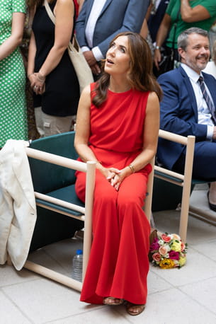 Mary de Danemark n'a pas lésiné sur son allure, ce jeudi 25 juillet, lors de l'inauguration du pavillon danois, installé dans la Maison du Danemark sur les Champs-Élysées. Habituellement en robe, elle s'est tournée, cette fois-ci, pour une combinaison rouge écarlate. Sa particularité ? Elle est évasée au niveau des jambes et drapée sur le haut. En plus, la tête couronnée avait apporté une veste blanche pour rappeler les couleurs du drapeau danois.