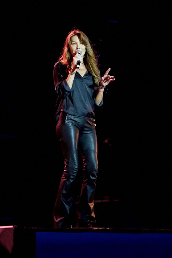 Carla Bruni a enflammé le festival Veranos de la Villa, qui se tenait Madrid, avec un superbe concert acoustique. Pour l'occasion, la chanteuse arborait un chemisier satiné ainsi qu'un pantalon en cuir évasé sur le bas, mettant parfaitement en valeur sa silhouette filiforme. Un total look noir composé de basiques de la garde-robe mais qui fait quand même son petite effet.