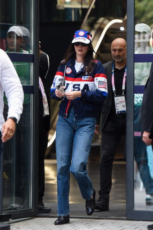 Assistant à la finale de la compétition de gymnastique féminine des Jeux Olympiques 2024, Kendall Jenner a montré son soutien sans faille pour les États-Unis. Elle portait en effet une veste de sport blanche, rouge et bleu marine, floquée "USA", accompagnée d'un jean droit et de mocassins noirs. On remarque également sa casquette assortie à sa veste, aux couleurs de son pays.