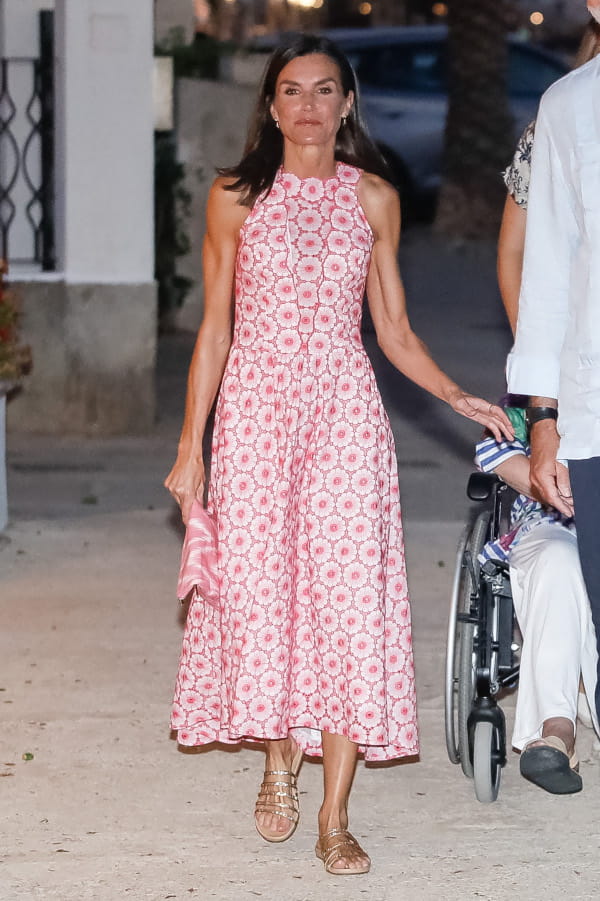 Actuellement à Palma de Majorque pour des vacances en famille, Letizia d'Espagne a encore une fois confirmé son statut mode. Elle a été aperçue avec une longue robe imprimée de marguerites dans les tons roses. Une jolie pièce portée avec des sandales plates dorées ainsi qu'une pochette en tissu à l'impression typiquement majorquine. Parfaitement dans le thème !