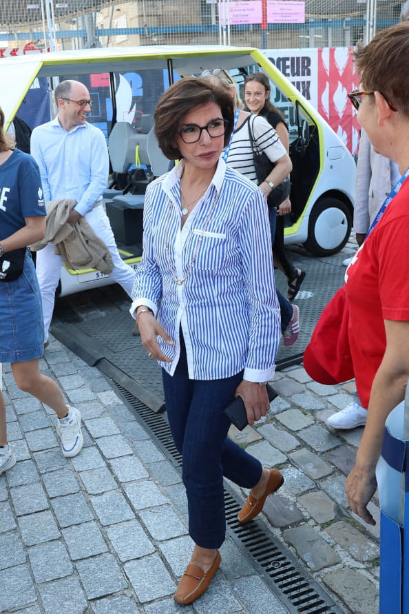 Rachida Dati multiplie les déplacements au sein des Jeux Olympiques 2024 de Paris. Ce 5 août 2024, elle s'est d'ailleurs rendue au Club France des JO ainsi que dans les studios de France Télévisions et de Radio France en portant une chemise rayée ainsi qu'un jean brut. À ses pieds, la ministre de la Culture avait enfilé d'élégants mocassins camel.