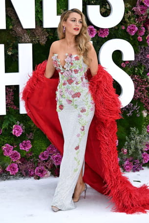 À l'occasion de la promotion du film It Ends with Us, Blake Lively enchaîne les apparitions mode. Ce jeudi 8 août 2024, c'était pour l'avant-première londonienne que la star affichait une somptueuse tenue. Au programme ? Une longue robe bustier qui épousait parfaitement ses courbes ponctuée de détails fleuris en strass. Avec, elle portait aussi un manteau à plumes rouges.