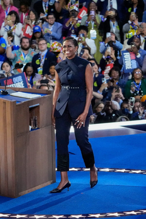 Michelle Obama a participé à la deuxième journée de la convention démocrate qui avait lieu le mardi 20 août dernier. L'occasion pour l'ancienne première dame de se montrer dans sa plus belle tenue. Au programme ? Un sublime costume noir sans manches agrémenté d'un col torsadé et d'une ceinture pour resserrer la taille. Et pour accompagner cet ensemble qui a déjà tout bon, elle est venue avec des escarpins à petits talons habillés d'un nœud.